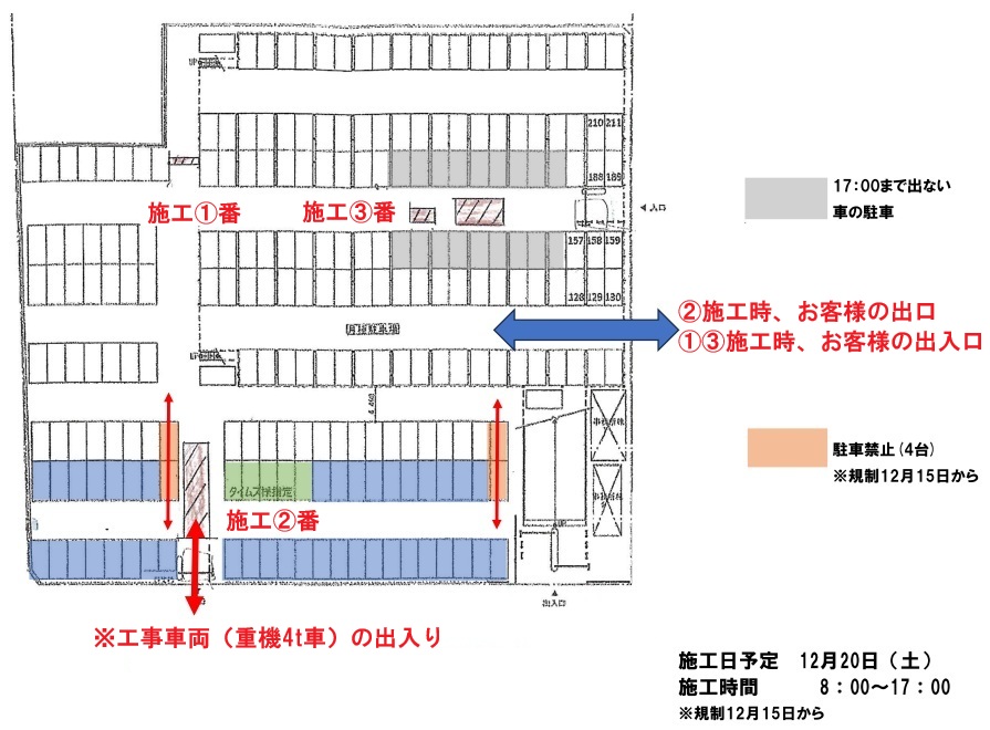 グレーの区画(18台分)工事日の 8:00〜17:00 に出庫予定の車両