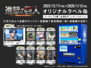 このたび、郡山駅東口駐車場に設置しておりますサントリー自動販売機にて、TAG LIVE LABEL企画による 「進撃の巨人」コラボ缶 を期間限定で販売いたします。